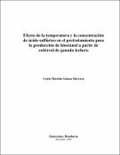 Gámez, C. 2008. Efecto de la temperatura y la concentración de ácido sulfúrico en el pretratamiento de bioetanol a partir de estiércol de ganado lechero. Proyecto de graduación del programa de Ingeniería en Agroindustria Alimentaria, Escuela Agrícola Panamericana, Zamorano. Honduras. 24 p. El etanol lignocelulósico es el producto obtenido de la fermentación de los azúcares hidrolizados de materiales ricos en celulosa y lignina. El estiércol es un material lignocelulósico que se diferencia por el nivel aproximado de nitrógeno de 3% en base seca, a diferencia del 1% que contienen otros materiales, como la madera, entre otros. Este estudio permitió evaluar el efecto de la temperatura y el ácido sulfúrico en el rendimiento de etanol lignocelulósico a partir de estiércol de ganado lechero. Se utilizó un diseño experimental de parcelas divididas, donde las parcelas principales fueron las temperaturas (110 y 121° C) y las subparcelas las conformaron los niveles de ácido sulfúrico (2, 2.5 y 3%), para un total de 6 tratamientos y 3 repeticiones, resultando en 18 unidades experimentales. Se utilizó un hidrómetro para determinar la cantidad de alcoholes producidos y se obtuvo un perfil de alcoholes a través de cromatografía de gases. El tratamiento con el cual se obtuvo el mayor contenido de alcoholes totales (60.13 % ± 0.65) fue el de 121° C y 2% de ácido sulfúrico. En cuanto al perfil de alcoholes, los tratamientos que permitieron tener el mayor rendimiento de etanol fueron el de 110° C con 2.5% de ácido sulfúrico y el de 121° C, con 2% de ácido sulfúrico; siendo este último el que rindió etanol lignocelulósico con el menor costo por litro: L. 12,630.00.,